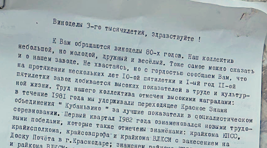 6 февраля на дегустации вин «Кубань-Вино» с их главным энологом Артёмом Васильевым был совершенно щемящий момент. Изначально было заявлено, что в конце встречи представят вино-сюрприз. Кто же знал, что Артем привезет нашему сообществу на пробу Кагор 32 урожая 1980 года? Прошлым летом на винодельне извлекли капсулу, заложенную тут … в 1982 году. Там было около трехсот бутылок и трогательное письмо из прошлого. Люди, жившие полтора поколения назад, знать не знали, что предстоит пережить нашей стране, и верили, что уж мы-то будем жить в лучшем из миров. Пиар-директор компании Аня Бойко рассказывала, что едва не расплакалась, читая это письмо.