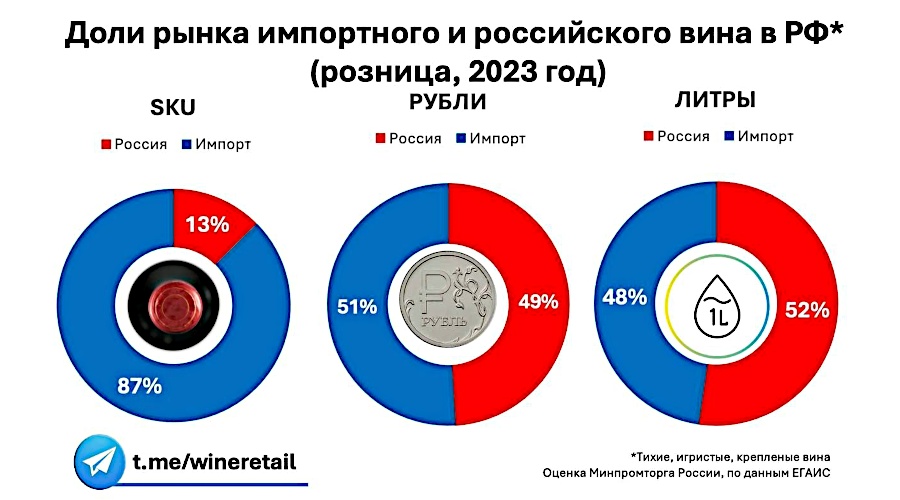 Есть ещё фактор формата розничной торговли. То, с чего начали этот пост. Или, например, продажи в ХоРеКа. Если дать оценку в литрах, уже сейчас продажи российского вина в этом канале — 45,71%. Но если посчитать в этикетках…