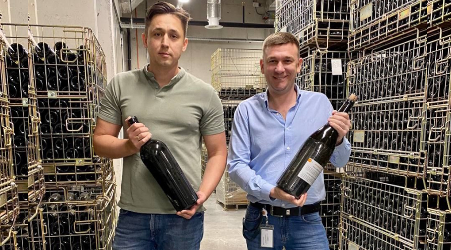 Кирилл Бардаков (слева) держит двойной магнум Красностопа Золотовского 2021 года урожая. Такое вино, но в обычных бутылках, уже есть на рынке. А трехлитровый Красностоп Золотовский появится в продаже в течение нескольких месяцев. Тираж 50 бутылок.