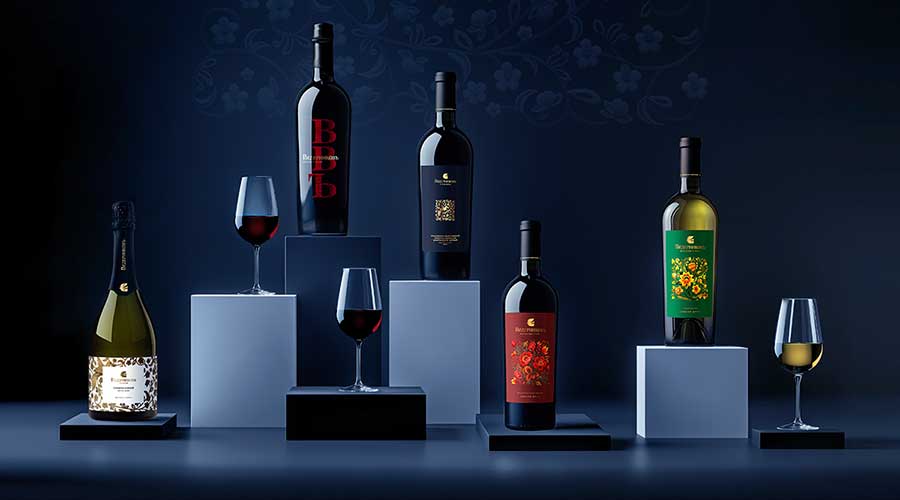 На нижнем уровне пирамиды так называемое донское вино — для супермаркетов. В оформлении используется птица Сирин.