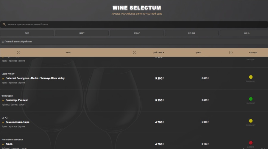 На сайте wine-selectum.ru/list можно найти практически все российские вина и подобрать нужные именно вам. Разработчики будут очень благодарны, если вы дадите обратную связь по приложению. Посмотрите свои любимые вина, согласны ли вы с оценками искусственного интеллекта? Пишите, задавайте вопросы, давайте обсудим новое приложение, помогающее в выборе вина.